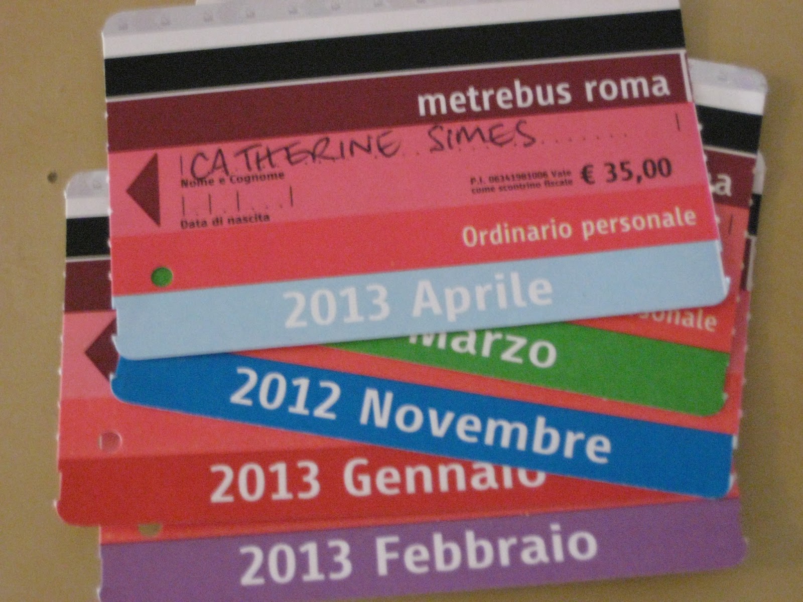 One of my favourite things about Rome is my bus pass. The 35 Euro a month travel card (that’s right London friends 35 EUROS to go ANYWHERE in Rome) covers all buses, all trams, all metro lines and all trains, including the 20km train ride to the sea which I take to work every day. Read it and weep. The coloured line at the bottom changes every month too, this month a very pretty sky blue. I like to collect them and use them as book marks, if only to see the months pass by. I’ve had 4 April cards so far.