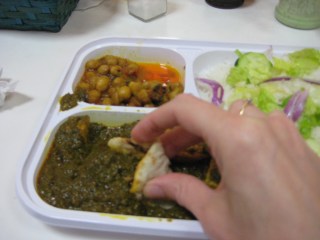 | spinach curry with roti, chick-pea curry and rice. |