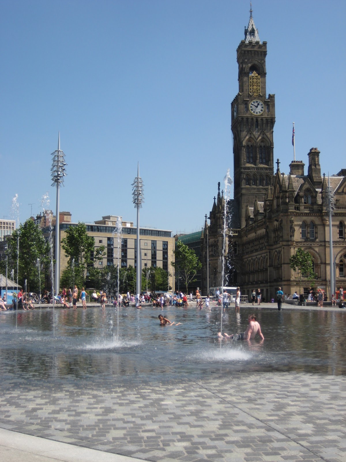 Bradford has always had a fountain in the square by the Italian inspired town hall, but since 2012 with the introduction of the Mirror Pool, we’re allowed to bathe in them too. I can’t really say swim, maybe paddle. But the 100 fountains have become a favourite with families on a hot day.