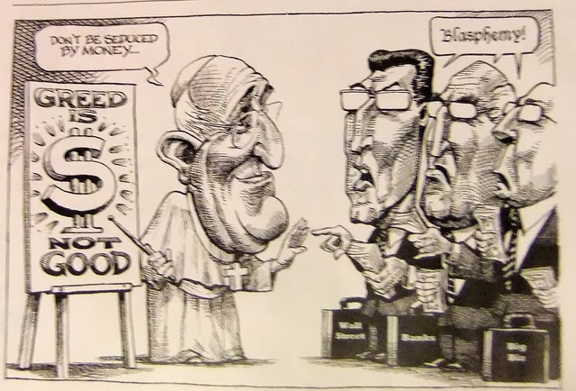 In his first papal document written in November he attacked the “idolatry of money” and called on world leaders to guarantee “dignified work, education and healthcare” for all. Criticising global markets he went on, As long as the problems of the poor are not radically resolved by rejecting the absolute autonomy of markets and financial speculation and by attacking the structural causes of inequality, no solution will be found for the world’s problems or, for that matter, to any problems.