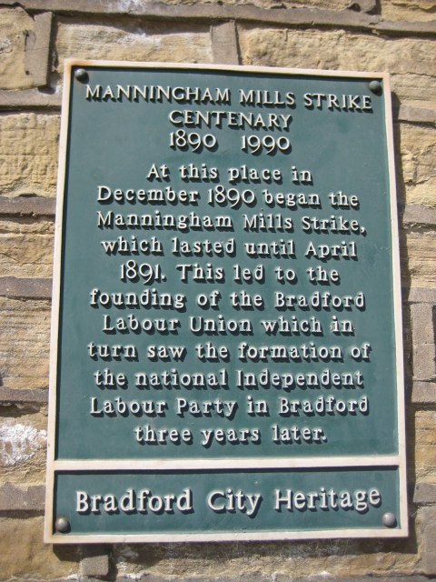 Manningham Mills, much like Bradford town hall, was built in the then fashionable Italianate style in 1871 and was the largest mill of its type in the world. This plaque commemorates the 1890-91 strike at the mill, following a proposed reduction in pay (the workers were scandalously being paid too much apparently). The strike gave a confidence to the workers, a belief that unified, strong protest could benefit the common good. It led firstly to the formation of the Bradford Labour Union and then to the founding of the Independent Labour Party in Bradford in 1893.