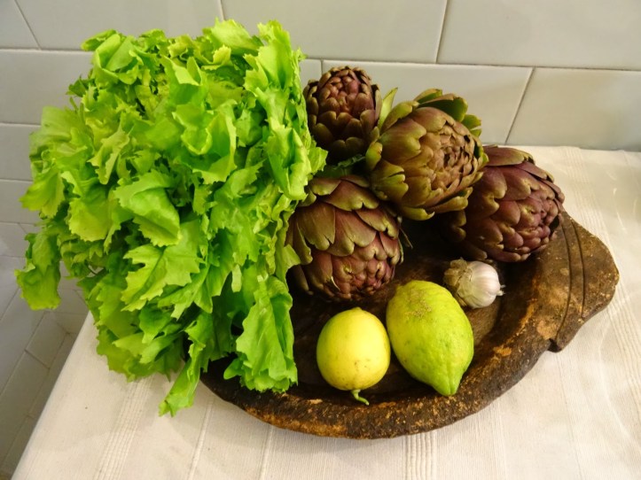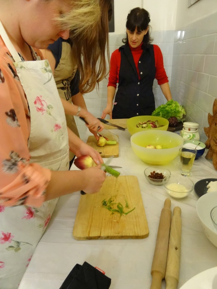 We began by cleaning an artichoke, Sandra makes it look easy. At first the guinea-pigs were not convinced they could manage it, but within minutes they were expertly cleaned. Add a ‘pizzico di sale‘ suggests Sandra, a ‘pinch’ of salt – what else could it be? By taking her students through each part of the recipe, step-by-step, Sandra makes it seem easy. Because the classes are so small, she is on hand to help, assist, laugh, teach new vocabulary.